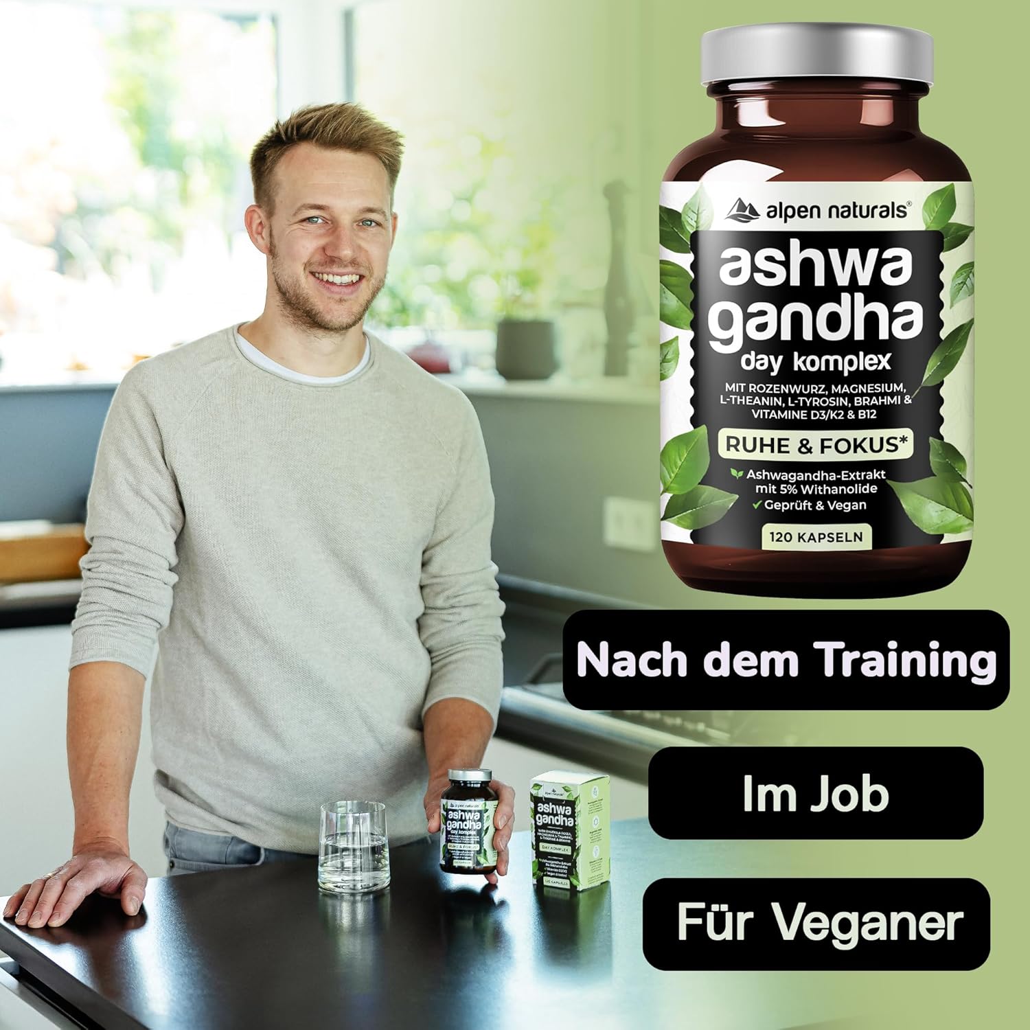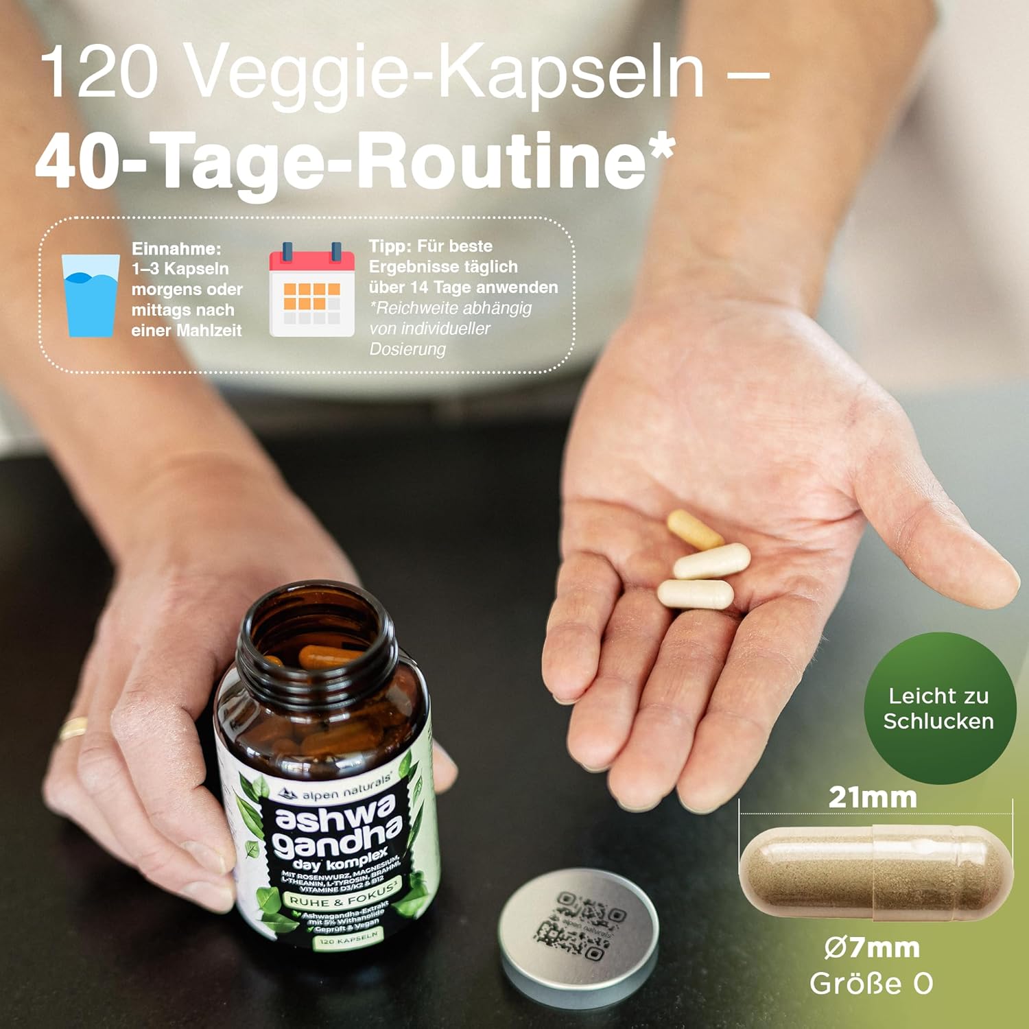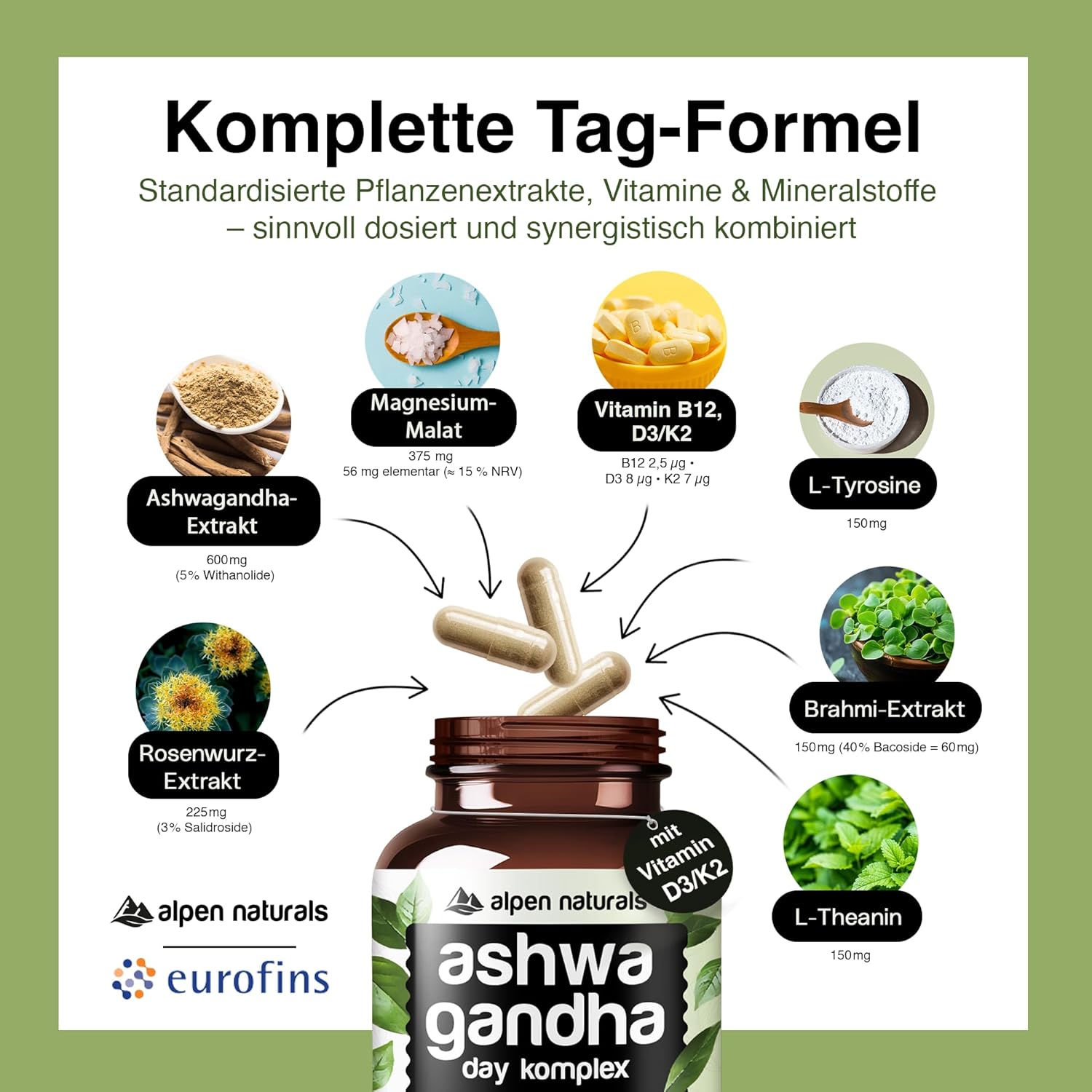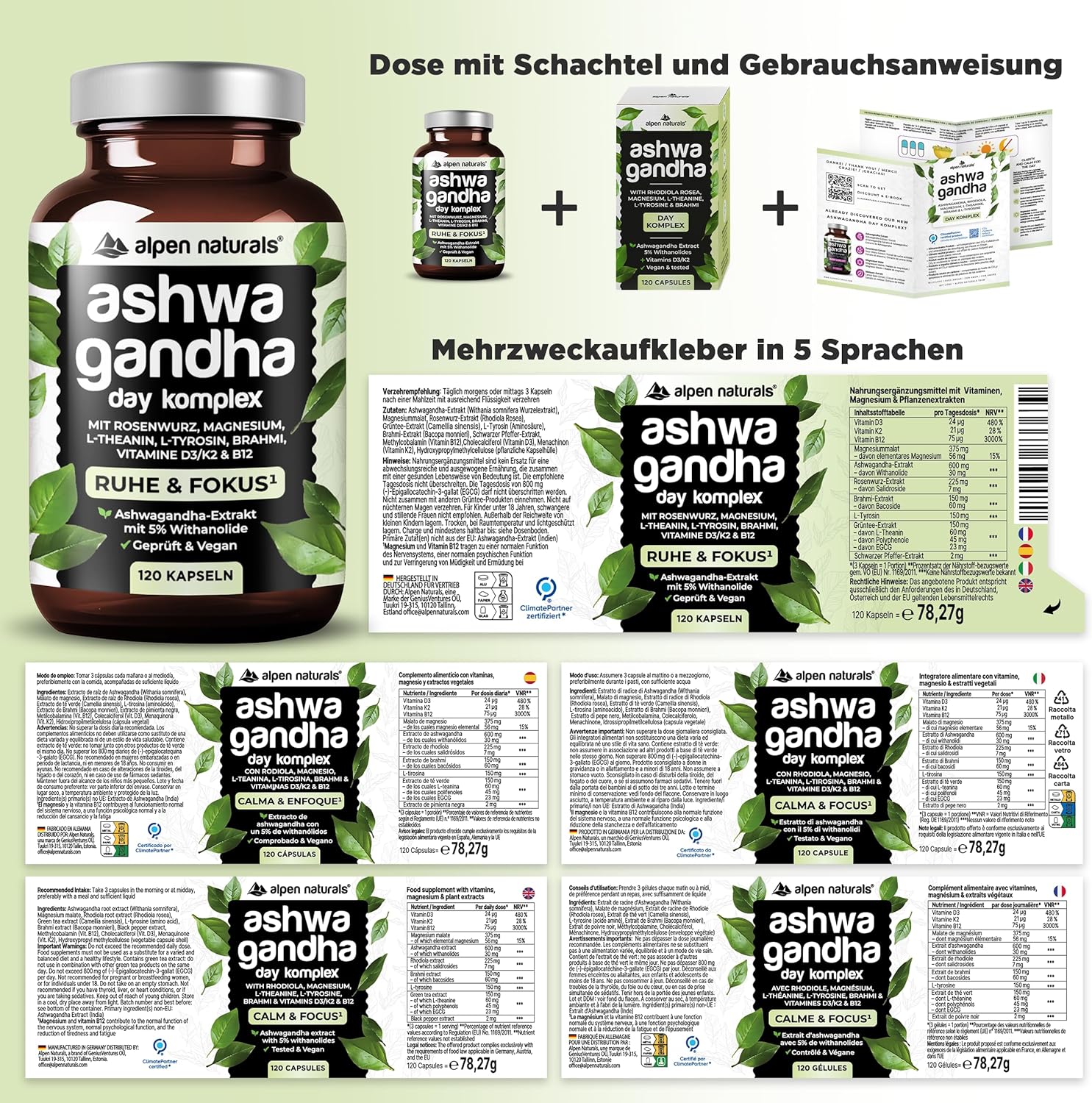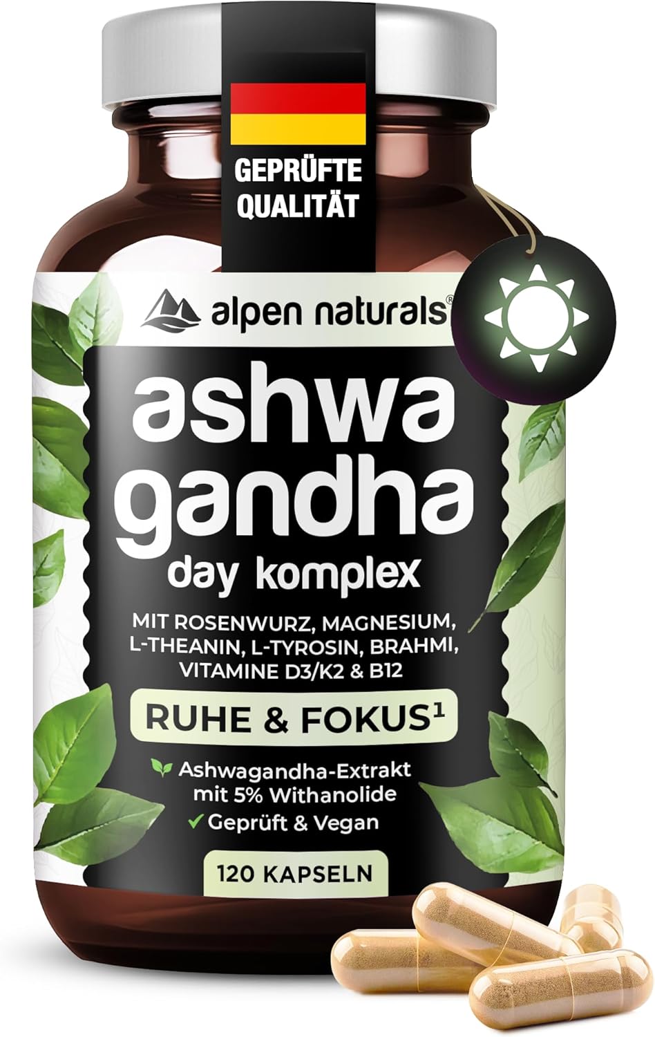Ashwagandha Complex Day Formula – 120 Capsules with Ashwagandha, Rose Root, Brahmi, Magnesium & Vitamins B & D3/K2 – High Dose, Vegan & Laboratory Tested – Made in Germany