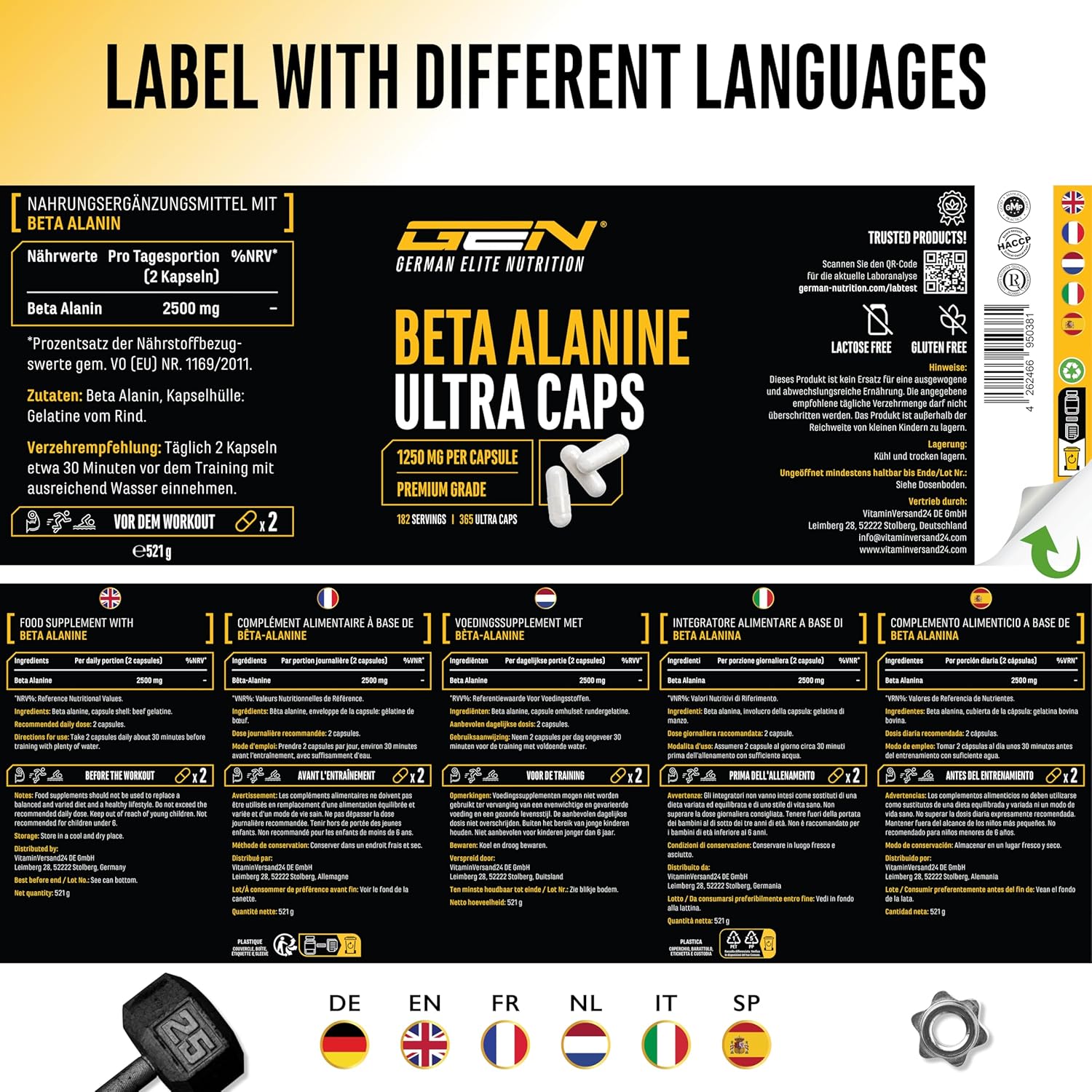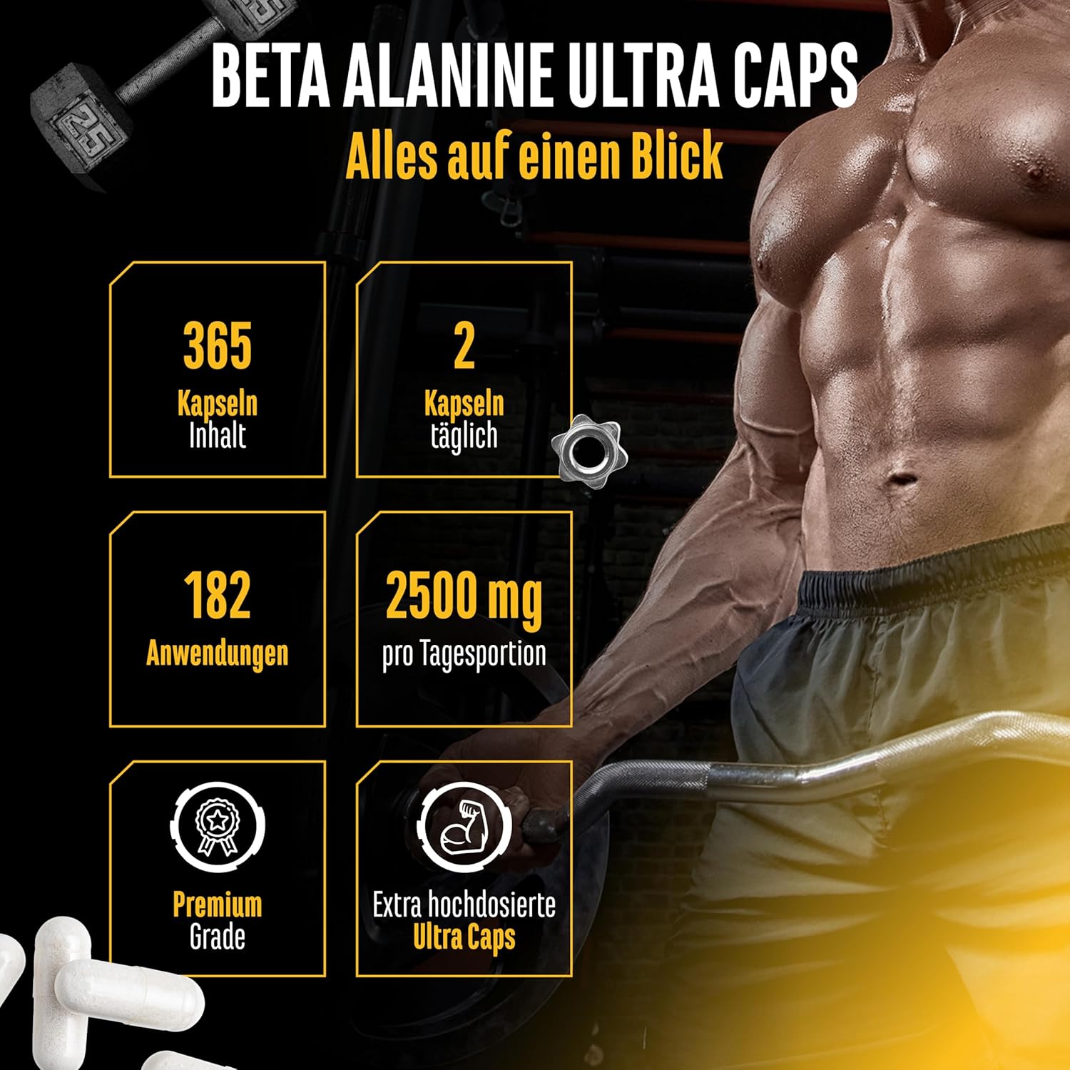 Beta Alanine Ultra Caps – 365 Capsules – High Dose with 1250 mg per Capsule – Beta Alanine Amino Acid with 99% Purity – No Unwanted Additives
