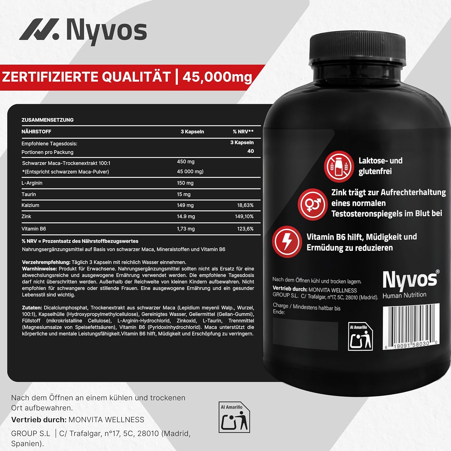 Black Maca 45,000 mg – 180 Vegan Capsules – Energy, Vitality & Testosterone – With L-Arginine, Taurine, Zinc, Calcium & B6 – European Product | Quality & Safety from the EU