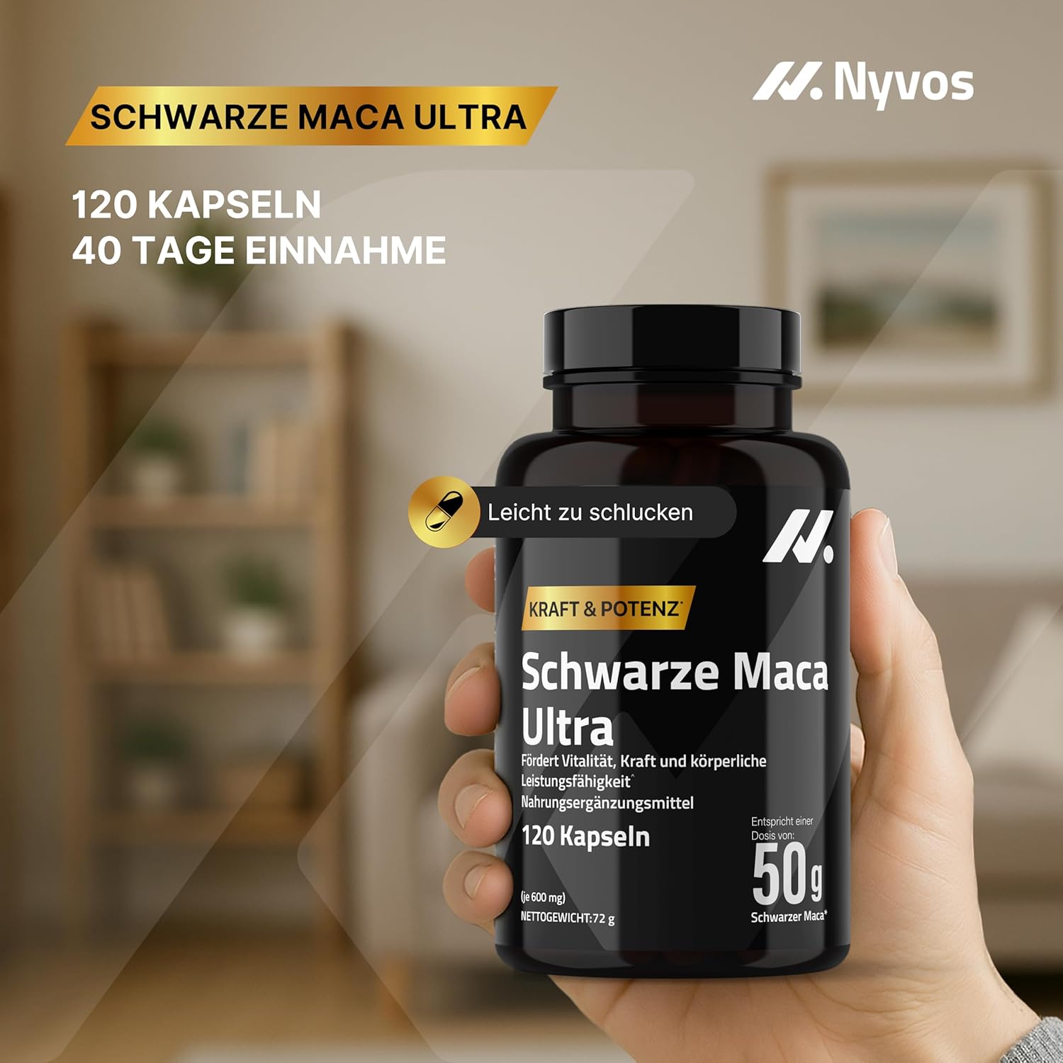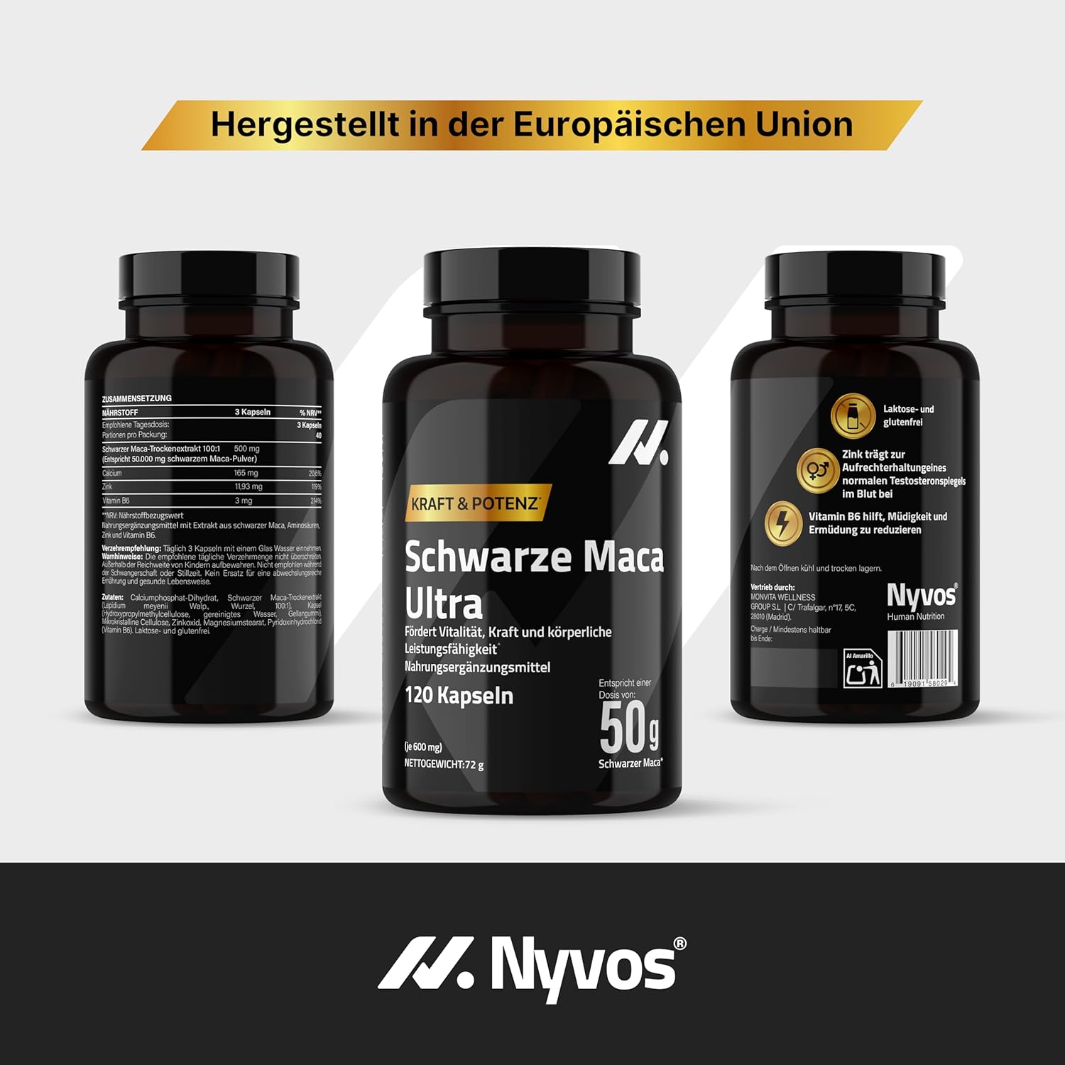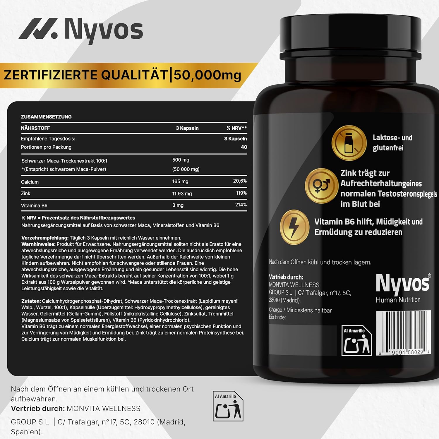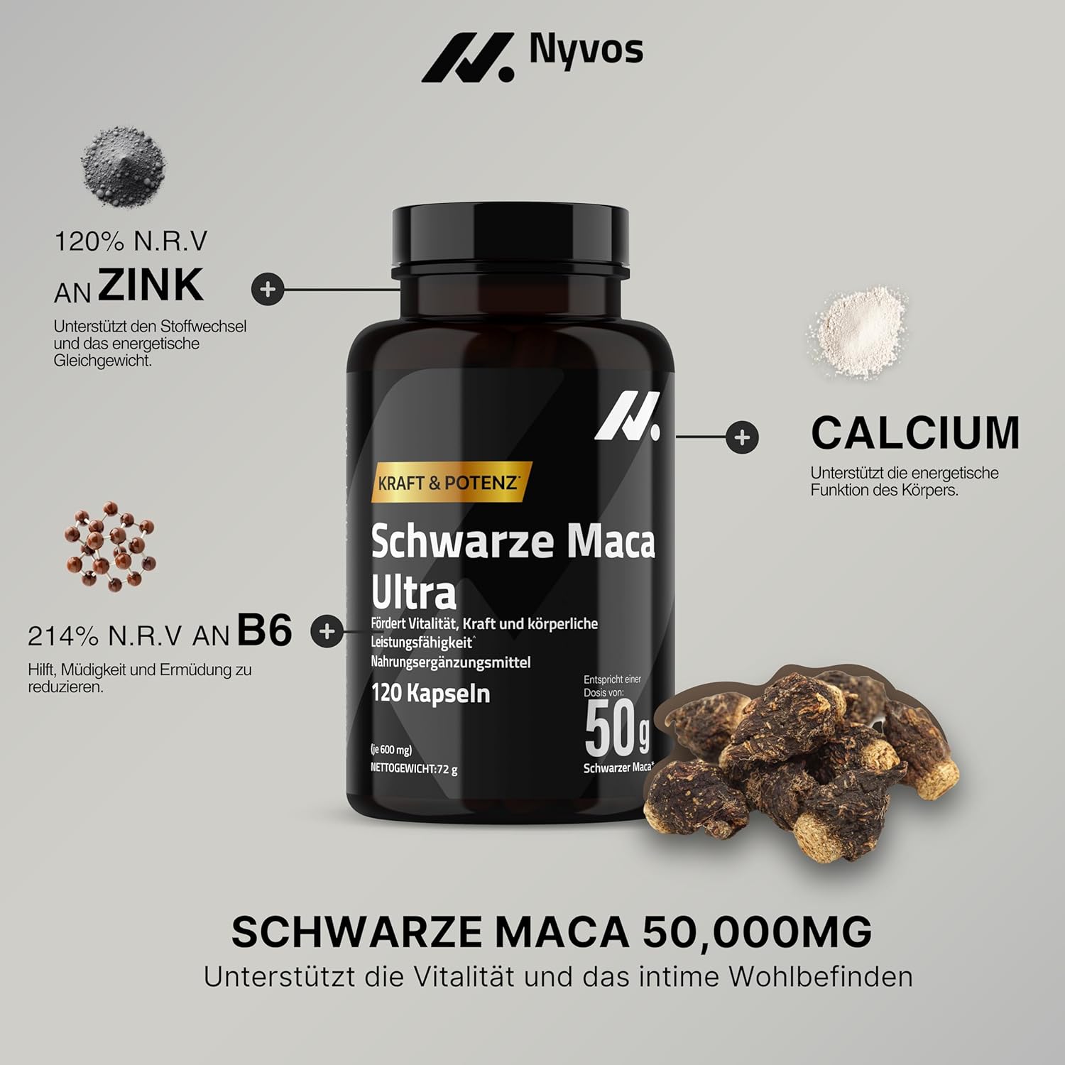 Black Maca Capsules High Dose 50,000 mg 100:1 – Black Root Extract with Zinc, Vitamin B6 & Calcium – 120 Capsules – Maca Root Extract for Energy, Vitality & Testosterone Booster – Nyvos