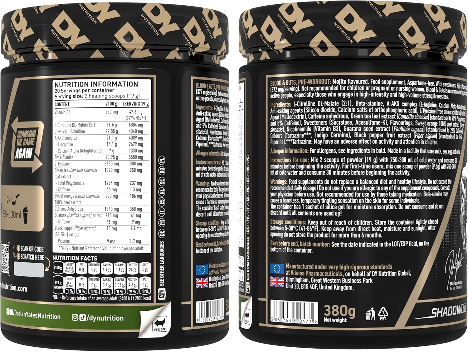 Dorian Yates Nutrition – Blood & Guts | Pre Workout Booster with Arginine + Citrulline (380 g, Mojito)