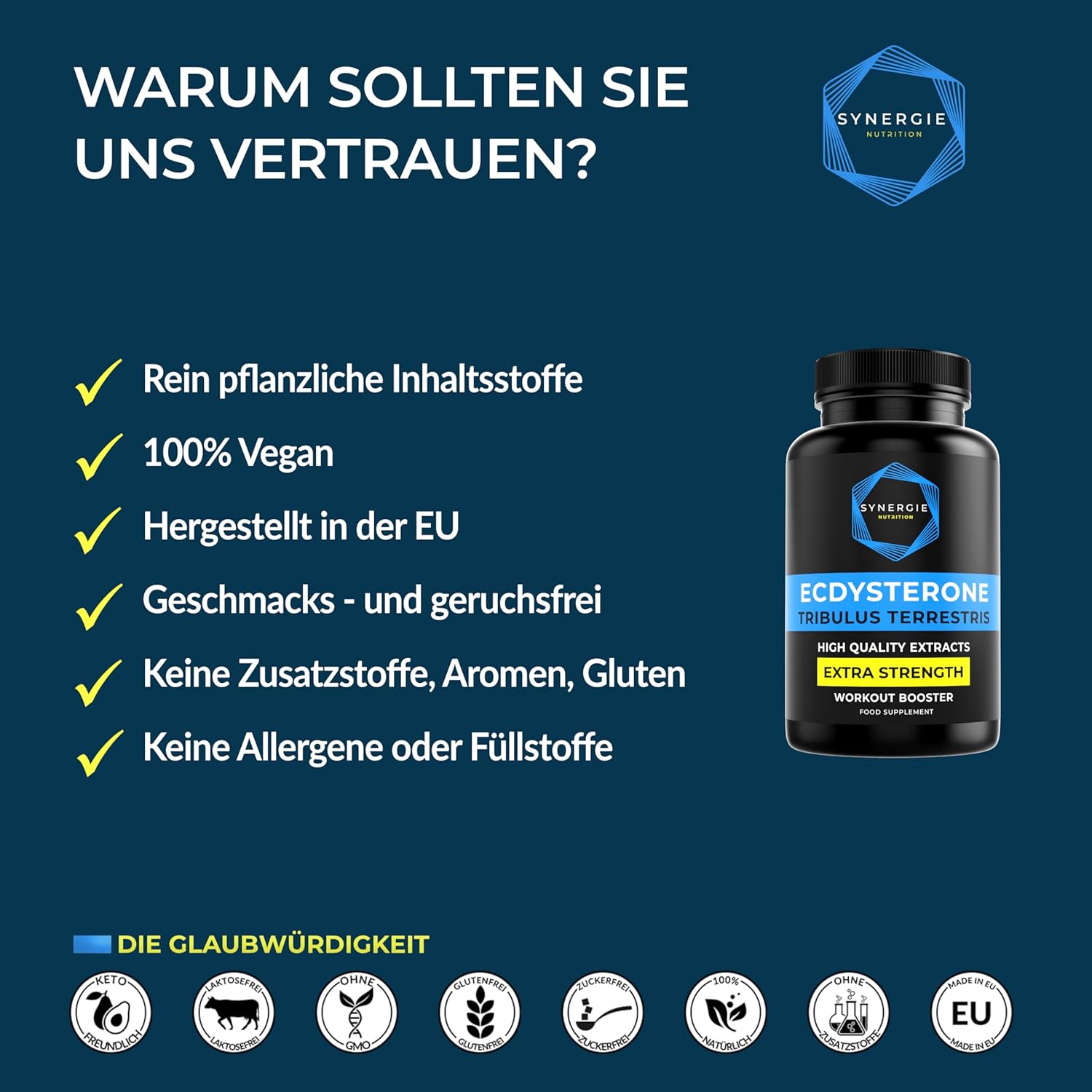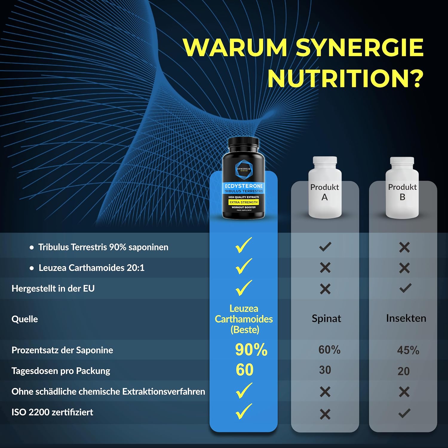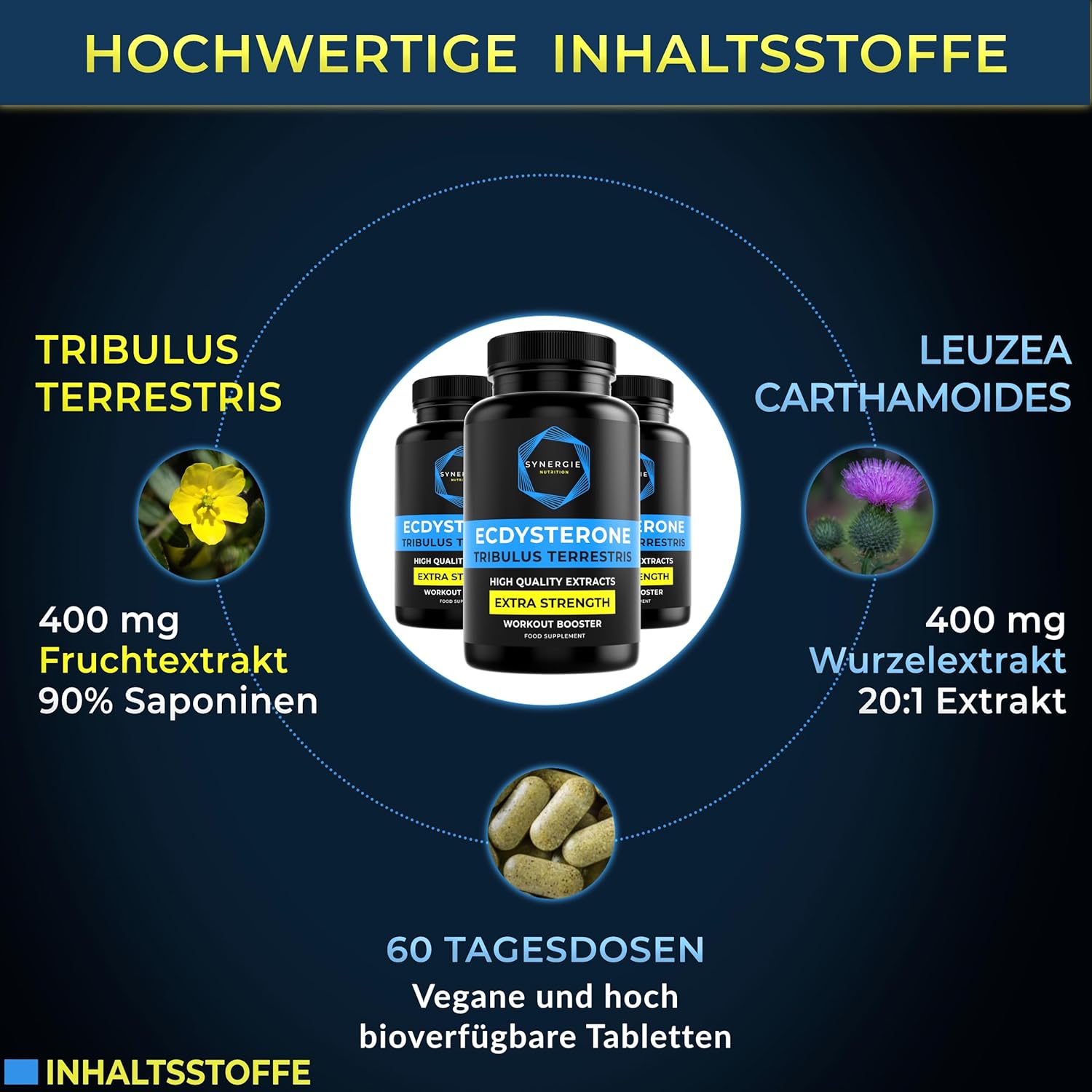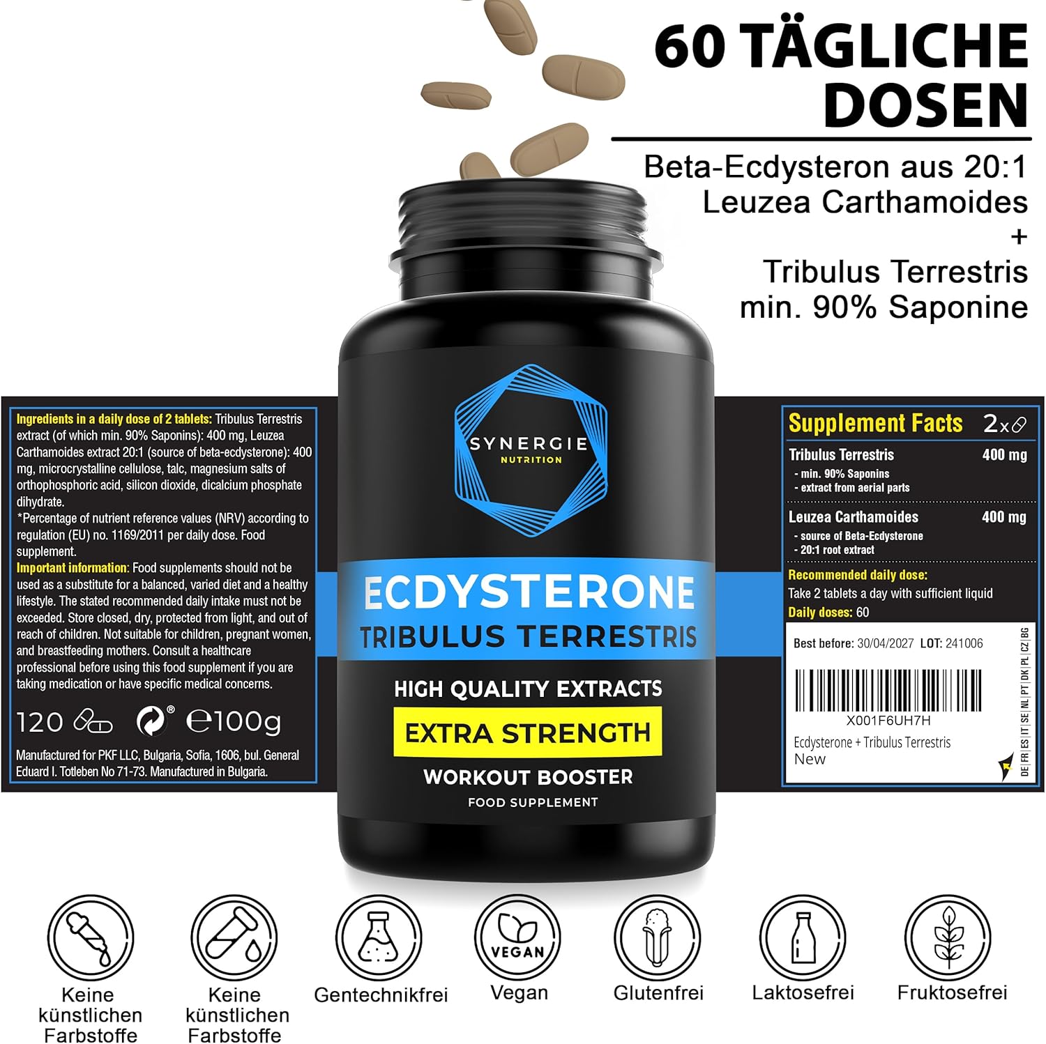 Ecdysterone from Leuzea + Tribulus Terrestris High Dose – Muscle Building Fitness Booster by Synergie Nutrition | 60 Daily Doses | Extract 20:1 | 90% Saponins