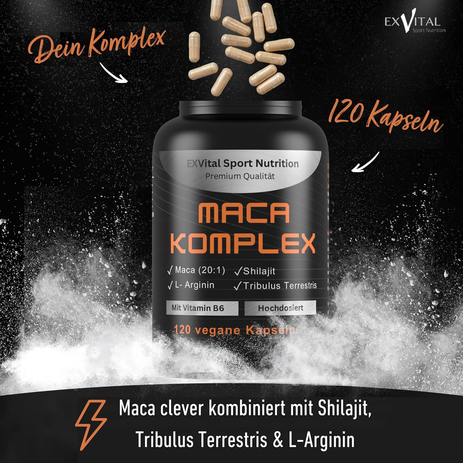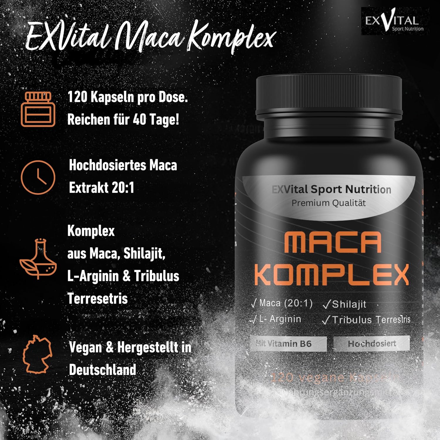 EXVital® Maca Complex High Dose – Maca 20:1 Extract with Tribulus Terrestris, Shilajit, L-Arginine & Vitamin B6, Active Booster, 120 Vegan Capsules, Laboratory Tested