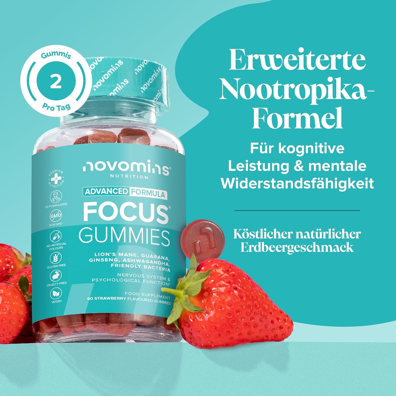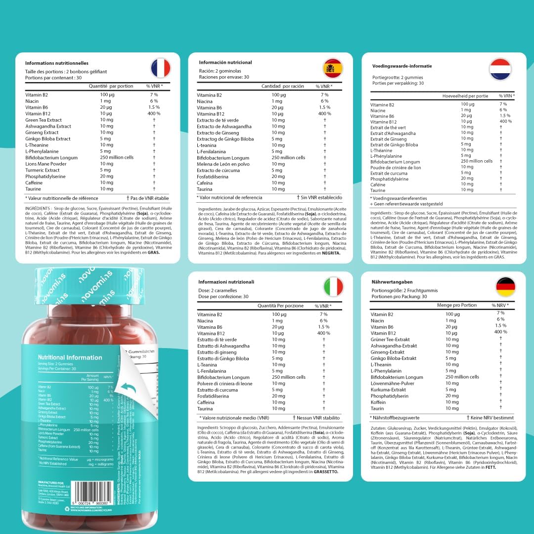 Focus Gummies – with Ashwagandha, Caffeine, Ginseng, Ginkgo Biloba, B12, Probiotic, L Theanine – for Focus & Concentration – Brain Supplement – Alternative to Caffeine Tablets – 60 Gummies Novomins