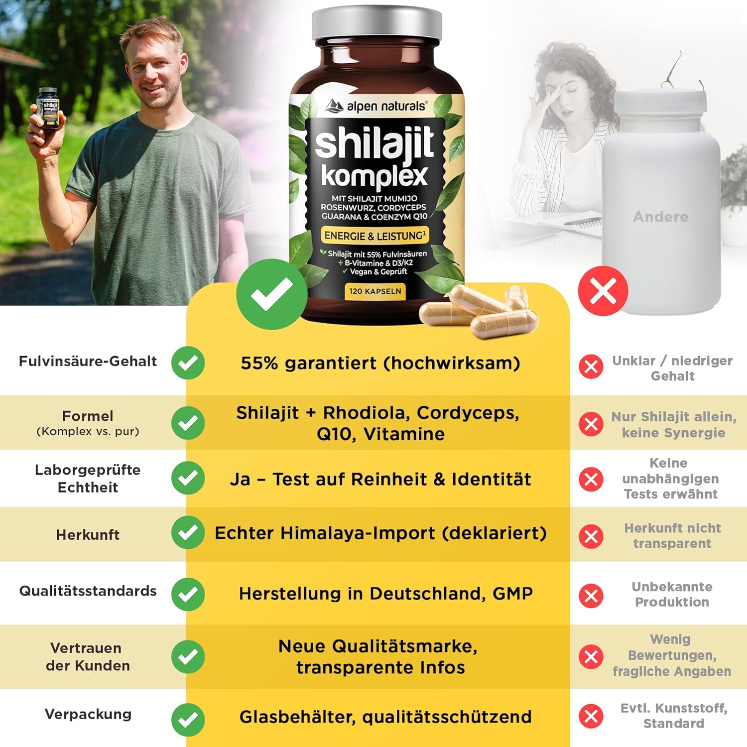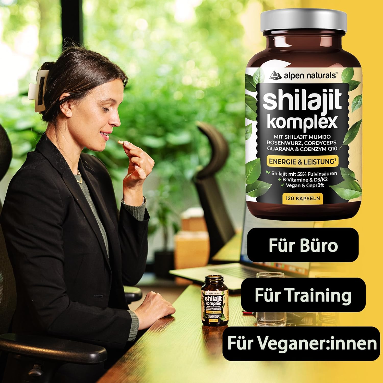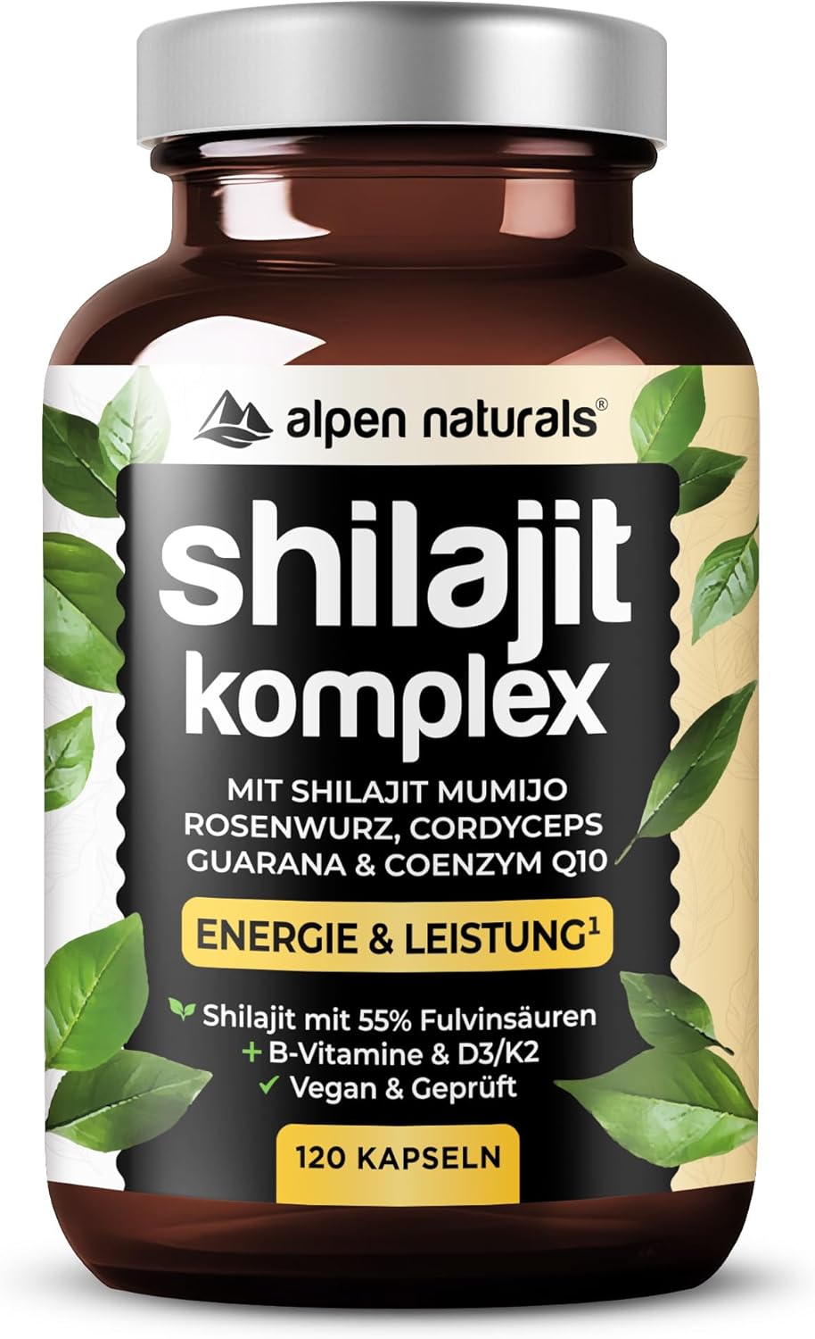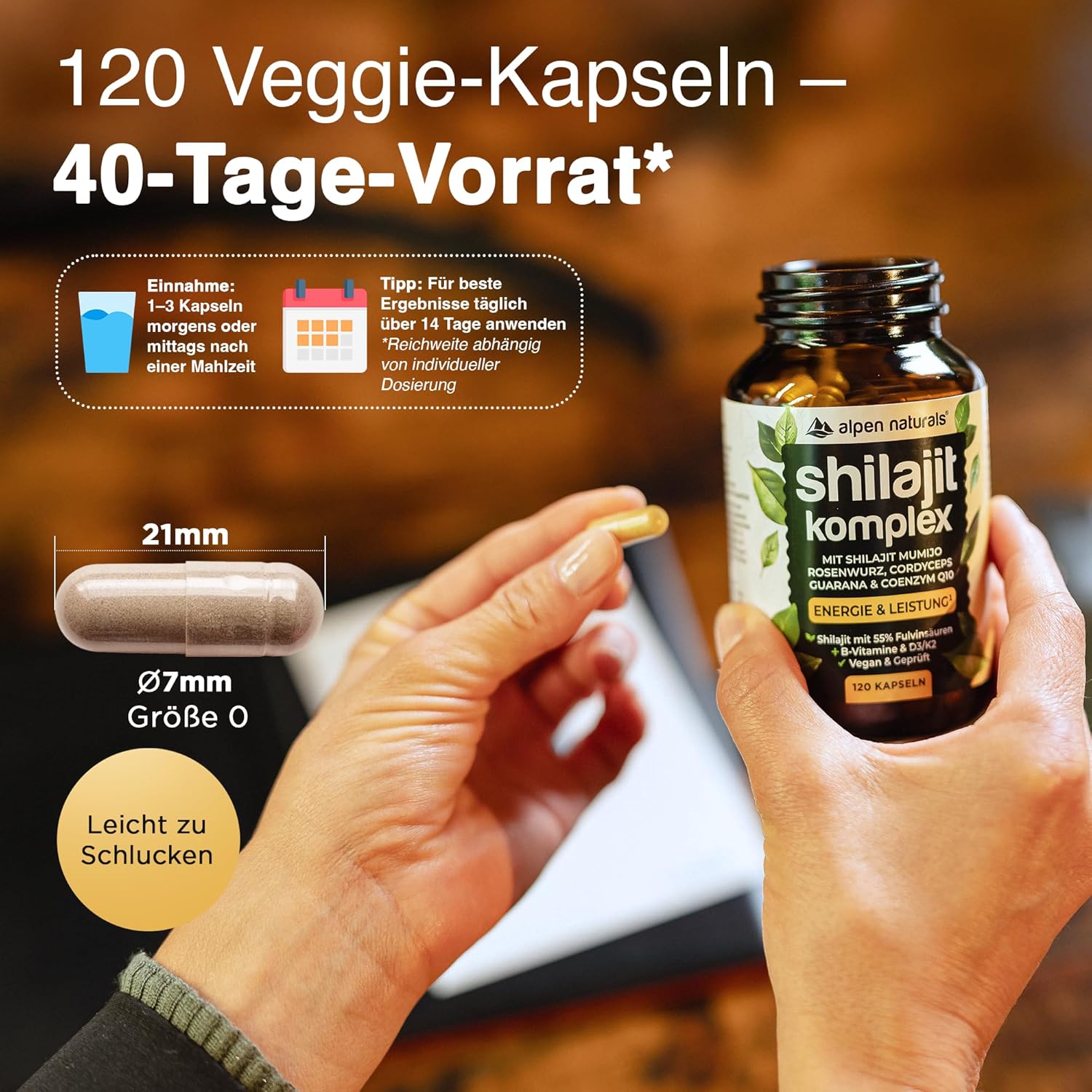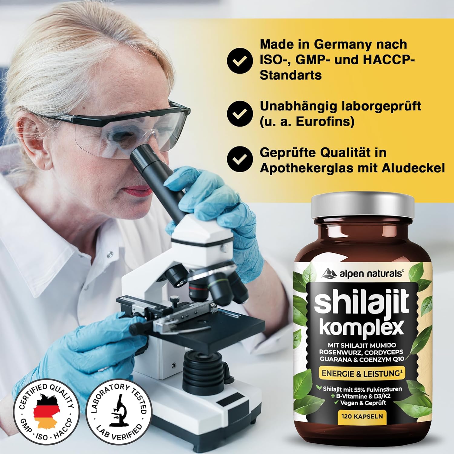 Shilajit Complex – 120 Capsules with Shilajit, Rose Root, Cordyceps, B Vitamins – High Dose, Vegan & Laboratory Tested – Made in Germany