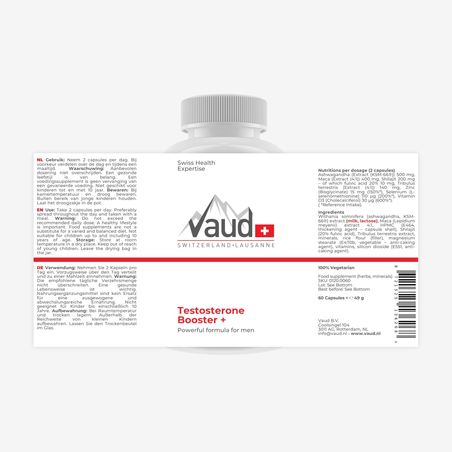 VAUD Testosterone Booster | Potency Agent Extra Strong for Men Instant Effect for Energy, Libido & Muscle Function | 60 Capsules | Made in Switzerland | With KSM-66 Ashwagandha, Tribulus & Zinc