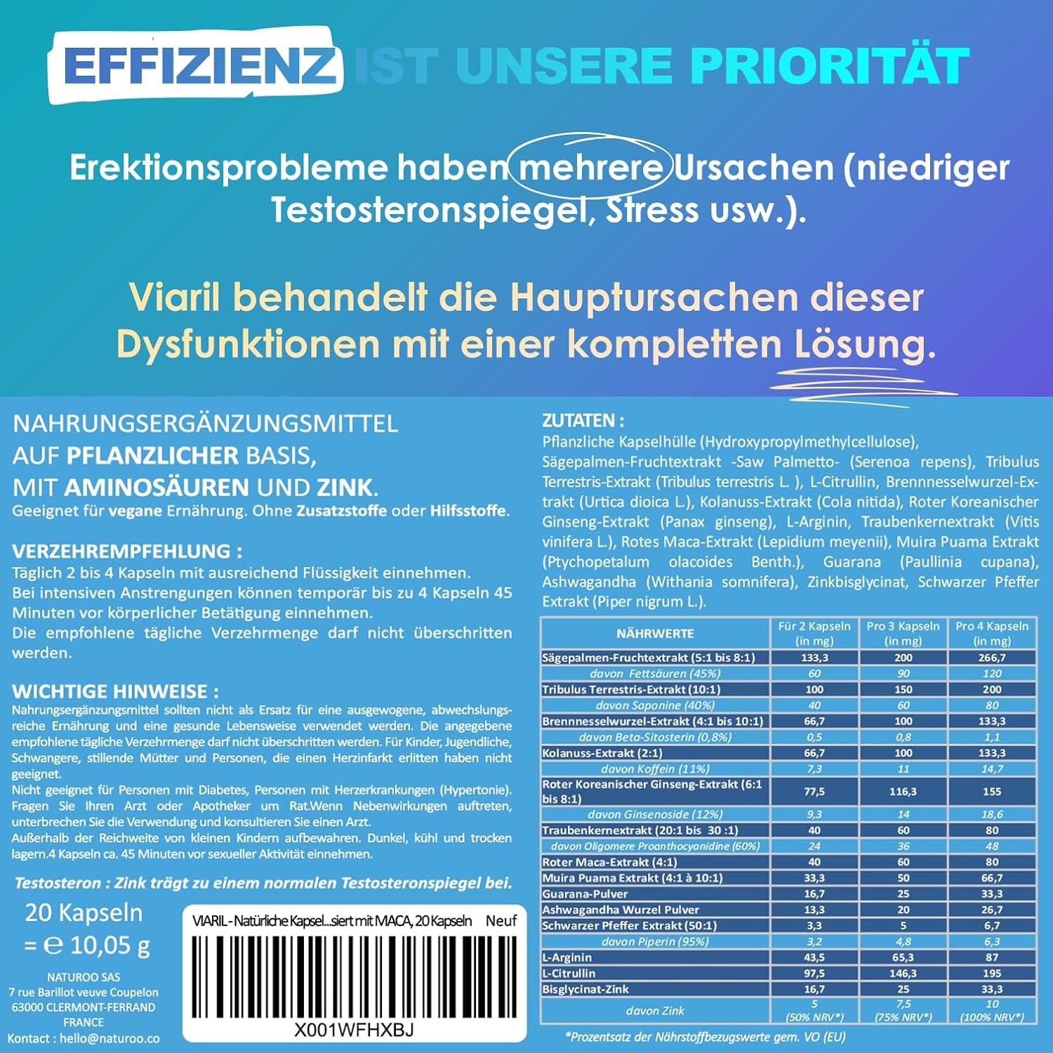 VIARIL – 20 Extra Strong Blue Capsules | For Active Men with Immediate Effect and Long-Term Effect | High Dose with 13 Active Ingredients (1630 mg), Including Muira Puama, Ginseng, Maca, L-Arginine